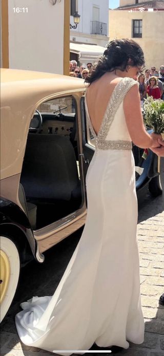Vestido de novia en crepe con aplicaciones bordadas y escote en la espalda. Talla 38/40. Su precio era de 2.200€ con etiqueta. Está impecable se puede ver y probar sin compromiso.