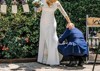 Vendo vestido de novia corte sirena de crepé, el vestido era sin manga y le hemos añadido al traje mangas tatuaje y sujetador incorporado ,como puedes ver en la foto , utilizado solo unas horas en la barra libre llevaba otro vestido. Talla 38 /40 ( mide 1,69 de altura , talla de pecho 80/85 y pesa 52 kilos. ) . Medidas del traje ( contorno de pecho 76 cm. , cintura 68 cm., y cadera 87 cm. ) regalo el velo , lo puedes ver sin compromiso.Lo entrego limpio( tintorería). Su precio fuè 2.090 euros .
