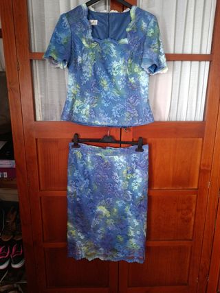 Conjunto clásico de 2 piezas (falda y cuerpo) de encaje tonos azules y verdes. No pone talla pero debe corresponder a una 38/40. Comprado en Higar Novias (Fuente Palmera/Córdoba).