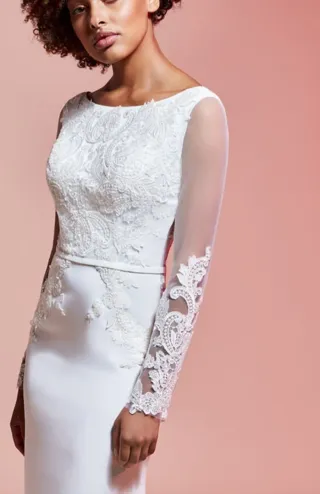 Vestido de novia elegante, sin usar y con etiqueta, NO esta arreglado el largo del vestido viene tal cual salió de la tienda. Talla 40-42 - Diseño de corte sirena. - Mangas largas con detalles de encaje. - Escote barco. medida: Cintura 74 pecho 95 Cadera 105