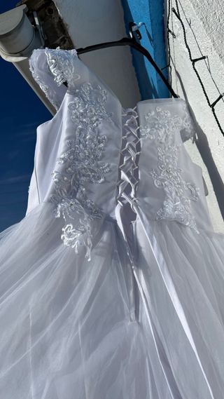 Elegante vestido de novia con detalles de encaje. - Diseño con hombros descubiertos. - Falda voluminosa con varias capas. - Adornos de encaje en el corpiño y el bajo. -Disponible el Cancan por si quieres la falda mas voluminosa Tiene algún desperfecto por el uso (en la cola esta un poco sucio del roce con el suelo ,pero la tintorería seguro lo quita ) Y en unas de las capas dela falda tiene unos abujeros pequeños , pero no se aprecia cuando se lleva puesto.