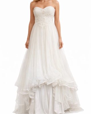 Elegante vestido de novia con un diseño strapless y detalles de encaje en el corpiño. La falda es voluminosa y cae en cascada, creando una silueta clásica y romántica. - Corpiño con aplicaciones de encaje. - Falda con varias capas de tela. - Diseño strapless. - no lleva cancán - Talla 42 adaptado un poco a la medida para ajustarlo mejor - Limpio de tintorería, usado únicamente un día