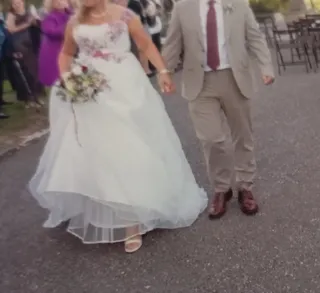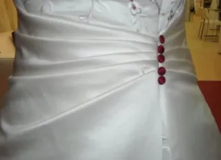 Elegante vestido de novia con detalles bordados. - Diseño con bordados florales en hilo granate. - Adornado con botones rojos y blancos. - Talla 40-42 - Incluye can-can para dar volumen.