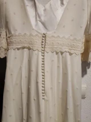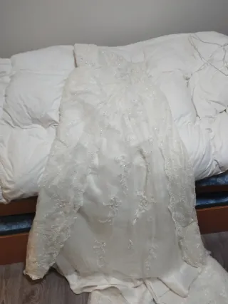 Se vende precioso vestido de novia del año 1984, con encaje, y volantes por detras con un poquito de cola. Tiene cinturon de raso, cremallera para abrochar y el velo blanco. Está hecho a mano por una modista profesional para una altura aproximada de 1,50 cm. y una talla mas o menos entre 40 y 42. Es ideal para una boda con estilo vintahe o retro. Se escucha cualquier tipo de oferta, siempre y cuando sea lógica, jeje. Por favor, solo cotactadme a traves de este chat.
