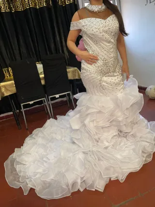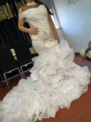 Elegante vestido de novia estilo sirena, con detalles brillantes. + zapatos de novia talla 41 - Diseño con hombros descubiertos. - Escote adornado con pedrería. - Falda voluminosa con volantes.