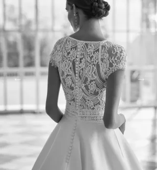 Elegante vestido de novia, sin estrenar, con un diseño clásico y romántico. - Cuerpo con escote cuadrado y mangas cortas de encaje. - Falda amplia con detalle de encaje en la parte delantera. - Espalda con lazada para un ajuste perfecto. - Color blanco radiante.