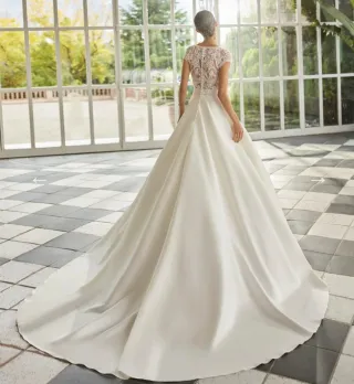 Elegante vestido de novia en satén de corte princesa, con detalles de encaje y pedrería. Talla 42 Mangas abullonadas Gran lazo trasero que se puede quitar