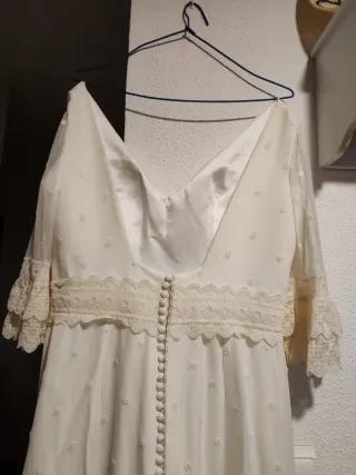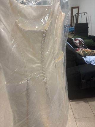 Nuevo con etiquetas. Usado únicamente para probarlo. En perfecto estado aunque algo arrugado de estar guardado. Talla L (40/42), yo uso una 42 y me queda ajustado. Regalo complementos, cinta y diadema oro rosa. Lo vendo porque al final me compré otro para mi boda. ⚠️ Tengo un gato. Todos los productos se envían limpios y bien empaquetados, pero es posible que algún pelito se cuele. Abstenerse alérgicos.