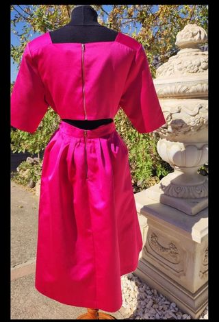 Espectacular vestido de firma Teria Yabar XL talla 42-44 . En tafetán color rosa buganvilla. Muy original la espalda en símil de parido en top y falda. Valorado en casi 400€ . Precio venta 125€. Nuevo de liquidación de tienda de novias y eventos.