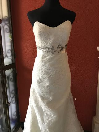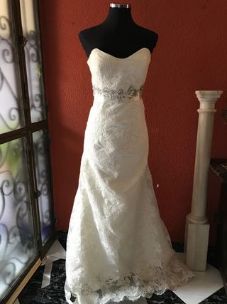 Vestido de novias Nuevo sin estrenar por cierre de comercio, es de encaje en palabra de honor con cinturón con detalles de piedras La talla quedaría perfecto para alguien que use 40 aunque es una 42 pero da poca talla