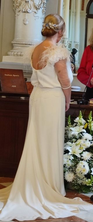 Vestido de Novia de la colección de 2022 de prestigiosa tienda de novias de Málaga. Color blanco/beige claro con cinta bordada a la cintura. Manga francesa de tul y hombros de plumas, espalda de falsos botones con cremallera. Media cola, ideal para ceremonia civil. Talla 40/42 con posibilidad de más talla por disponer de tela. Con cancan de neopreno