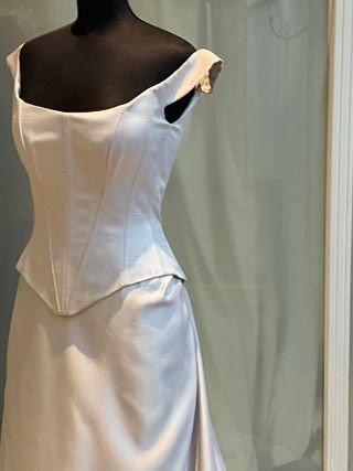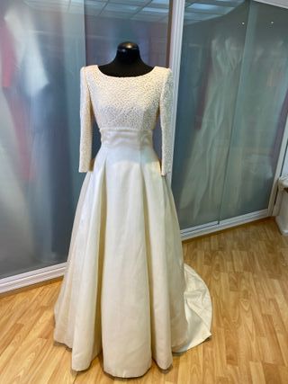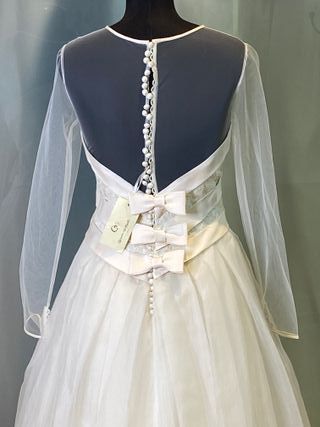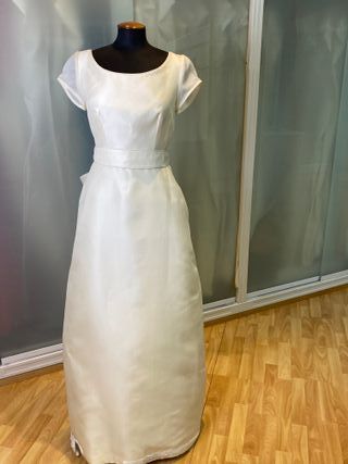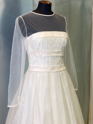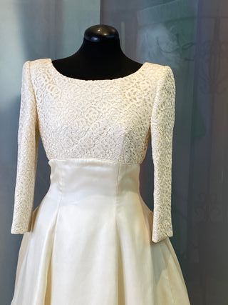 delicado vestido de novia en organza de seda natural , corte a la cintura , efecto palabra de honor con tul interior que se adapta al cuerpo , el maniquí al no tener brazo no lo puedo poner bonito manga larga , también puedes quitar el tul descoserlo y hacer un palabra de honor , vestido con toque años 60 vintage , propio de las actrices de hollywood. talla 42 española talla 40 francesa contorno pecho 94 cm contorno cintura 74 cm contorno cadera 104 cm