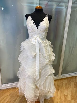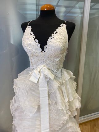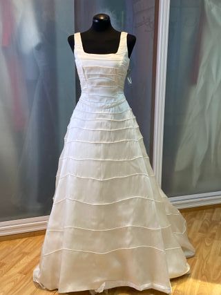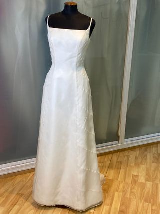 vestido de novia en tirantes fino , tejido delicado en organza de seda natural , nuevo sin estrenar , en perfecto estado , cremallera y botones , corte en evase estiliza muchísimo talla 42 española talla 40 francesa contorno pecho 92 cm contorno cintura 74 cm contorno cadera 104 cm