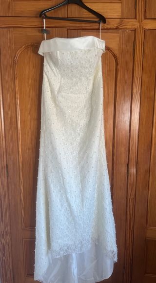 Precioso vestido de novia, sin estrenar. Diseño elegante y de sirena.Cuerpo con detalles de pedrería y encaje. Tiene cola. Vestido de novia blanco roto con perlas. Es muy bonito y delicado. La talla puede ser de la 42 a la 44. Este vestido tenia de precio de 1700 eur