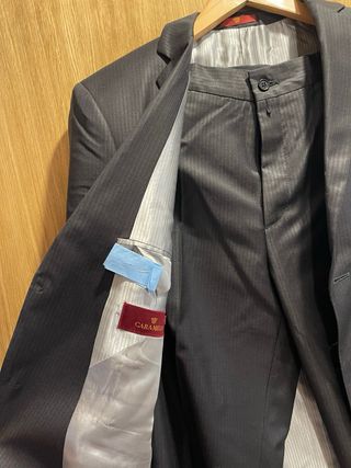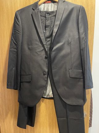 Traje de dos piezas para novio o eventos especiales. - Chaqueta con solapa de muesca y botones forrados talla 50 - Pantalón de vestir, pone talla 44 pero es más bien una 42 - Tejido con finas rayas verticales. - Usado una vez y llevado a la tintorería