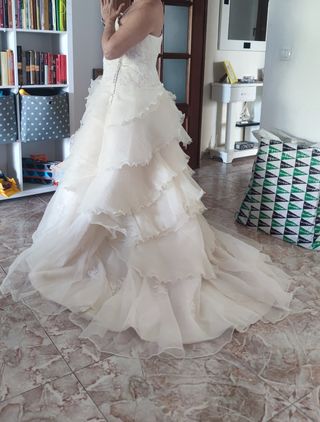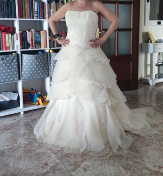 Año 2013. Esta limpio. Talla 44 sin arreglar de largo ni tallaje. Tiene una poca de cola. Color blanco roto. Incluye can can y velo (lleva su peineta para ponértelo)