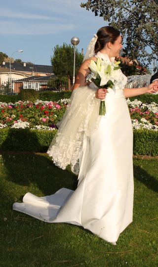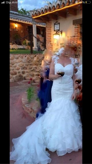 Vestido de novia de Vertize Gala.Usado el día de la boda.Es una talla 44 con algún arreglo.Lleva copas por dentro para ponerlo sin sujetador puesto que la espalda es transparente.Está manchado por dentro del arrastre(adjunto fotos).Nuevo costó con las copas 1015€.