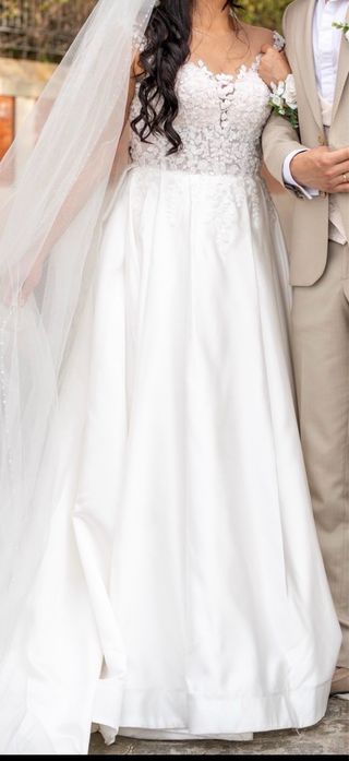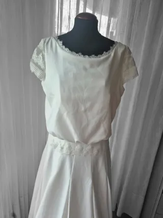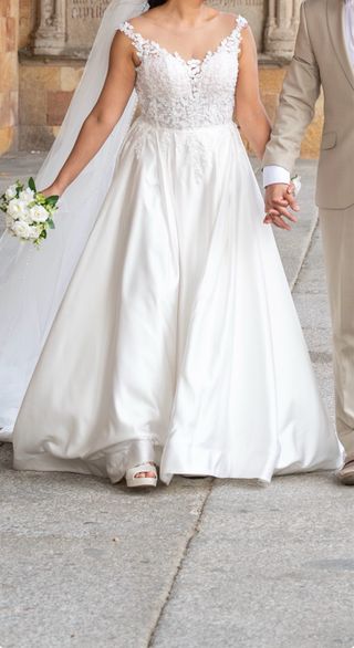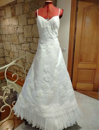 Vestido de novia, talla 46, en excelente estado, cuidado y lavado Es un diseño muy romántico y elegante. Tiene el cuerpo ajustado con aplicaciones de encaje floral en relieve y una falda amplia estilo princesa/línea A con preciosa caída y movimiento. Es muy cómodo y estiliza muchísimo la figura. Originalmente tenía escote en V más pronunciado, pero se le añadieron delicados encajes en la zona del pecho para hacerlo más cubierto. Estos encajes se pueden retirar fácil - Cuerpo con escote en V y manga. - Falda voluminosa de satén.