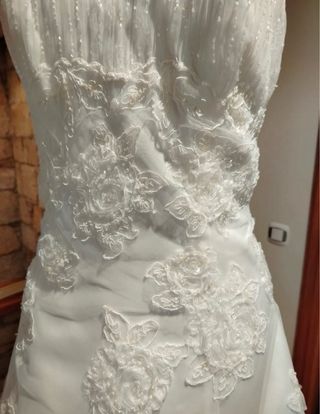 Vendo vestido de novia. Limpieza en tintorería después de boda. Lleva estilo corset, así que es muy adaptable en cuestión de medidas. En contorno de pecho sería 130 más o menos el máximo. Cintura 120 max. Mido 1,62. Si eres talla grande y te cuesta encontrar vestido, este es perfecto, esta pensado para talla plus y sienta estupendo. Es largo, con cola y el tejido es suave y precioso. Lleva dos añadidos, una tela para cubrir un poco el escote y que no quede tan abierto, y unas flores negras de piedrecitas a la izquierda de la cintura.