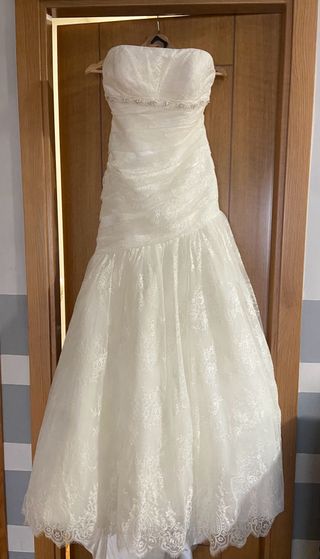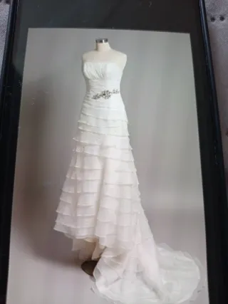• vestido de novia - palabra de honor, con pedrería y cola. - tallaje con pliegues en el frontal, acabado en tubo. • es un blanco roto, no blanco liso. • marca ; LA SPOSA. !! completo sin zapatos !! - talla: M ; 38. ( incluye el vestido, la enagua y el velo ) • se mantiene en perfecto estado y está divino. • perfecto para una vestimenta elegante y económica. • !! precio negociable, de primeras se mantiene el precio fijo !! • el velo se puede vender individual. ( 100 € ) - !! precio también negociable, pero preferiblemente también se mantiene con el precio fijo !!