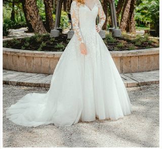 Vestido de novia aire Barcelona modelo etapa 2020 con mangas plumeti encaje precioso , espalda en forma de lágrima y falda de tul Es un vestido espectacular!! Tiene en el pecho relleno y no hace falta sujetador. Talla S ,altura 166+8'5 del tacón que llevaba. Tiene un lavado básico de la tintonería, no tiene manchas solo en el forro interior lo que se ve en la foto y no se ve aunque quizás haya que darle otro lavado básico más que nada por planchando de estar guardado