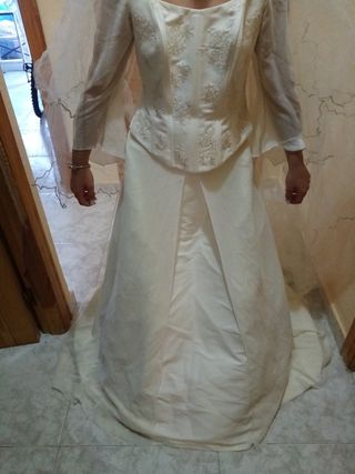 Vestido novia... Consta de corpiño con bordado a mano y mangas de seda, falda con doble falda de seda.. Con cola.. Cancan y velo con bordado a mano plateado