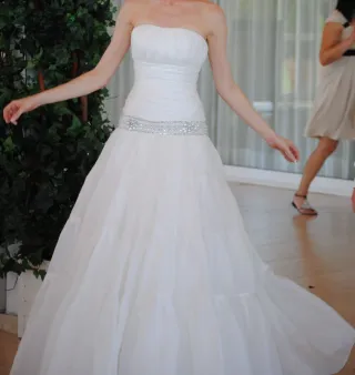 Elegante vestido de novia, perfecto para tu gran día. Diseño strapless con detalles delicados. - Adorno de flores en la cintura. - Cinturón con pedrería y cristales. - Escote corazón. Muy elegante, con tejido de organza royal. Escote corazon. el cinturon esta incluido. talla 36-38. No incluye cancan. se puede añadir tirantes, o llevar bolero, estola o chaqueta. muy buen estado