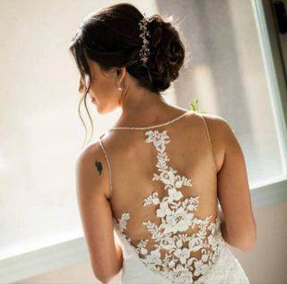 Comprado en Sedka vestido de novia precioso. Era talla 42 pero se realizó algún arreglo para estrechar. Con brillo y gasa bajera en color nude. Tiene un poco de cola y los laterales en cruz de pedrería. Es comodísimo y precioso.