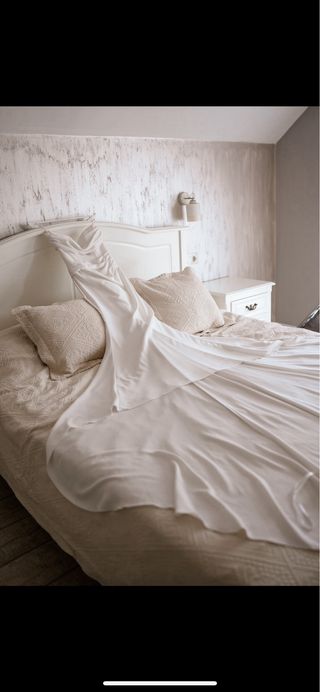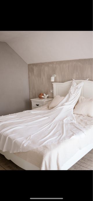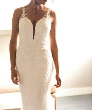 Vestido de novia muy ligero y cómodo con un corte muy favorecedor. Es la talla L aunque da muy poquita talla ya que mi talla de vestido y camiseta es la M. Sin problema para probar o enviar fotos adicionales. Las mangas están arregladas para convertirlo en 3/4 que queda mucho mas bonito y tambien para estrecharlas un poco. Está en perfecto estado. Estatura 172 y ajustdo a 6 cm de tacón