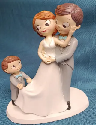 Figura decorativa para tarta de boda con novios y un niño. - Diseño tierno y divertido. - El niño sujeta el vestido de la novia. - Ideal para pasteles de boda o celebración familiar.
