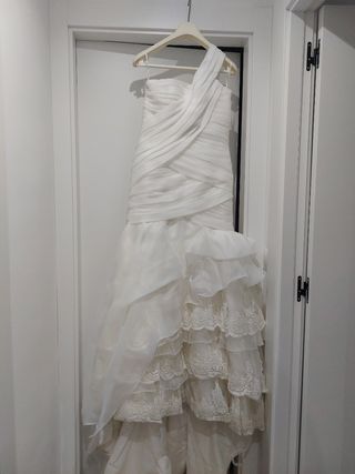 Vendo vestido de novia de la marca Aire. Costó 1700€. Parte superior de encaje con cuello halter y a partir de la cadera todo volantes que alterna tul y encaje. La cola es bastante larga. Solo está usado el dia de la boda, no hubo post boda y fue llevado a la lavanderia. Los signos de desgaste que tiene son los normales por el arrastre del vestido unicamente en la parte delantera del vestido. En la parte de los botones tiene tambien algun hilo suelto pero no es roto. En el vestido pone talla 42 pero está a medida de una talla 34, una talla 80/85 de pecho y para una altura de aproximadamente 1,52m . Si eres de Alicante no hay problema en que vengas a probartelo sin compromiso.