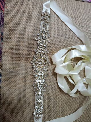 Precioso cinturón de pedrería y cinta color champagne. Hermoso para un vestido de novia u otros. Utilizado una vez