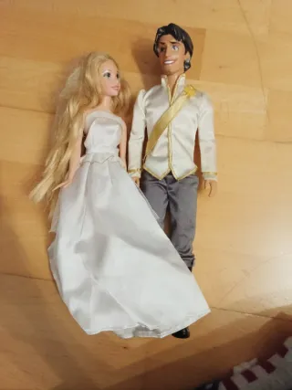 Set de muñecos de los personajes de Disney, Rapunzel y Flynn Rider, vestidos para una boda. - Muñeca Rapunzel con vestido de novia blanco. - Muñeco Flynn Rider con traje de novio.