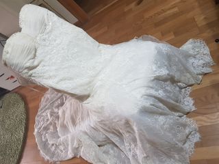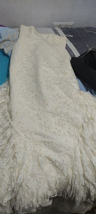 vestido que se usó un día y no se ha vuelto a usar en el 2018 hay que llevarlo al tinte pero está en buen estado,corte sirena con volantes en la cola y la parte trasera