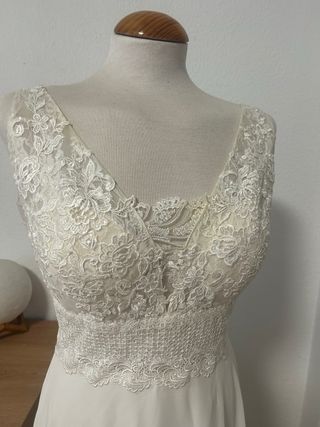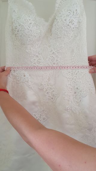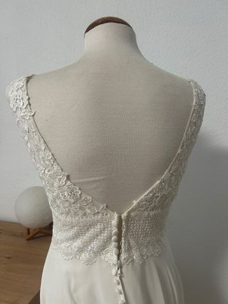 Vestido de novia de seda con fino guipur por encima y gasa en escote. Ademas lleva adorno de pedreria en la parte de delante del escote, que es de corazón. Tambien el escote baja en la espalda. Tiene un poco de cola. Esta sin estrenar porque no pudimos casarnos en ese momento y cuando nos casamos mas tarde yo ya estaba embarazada y me tuve que hacer uno a medida.