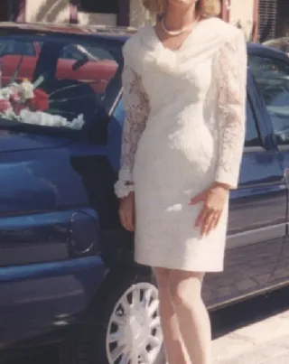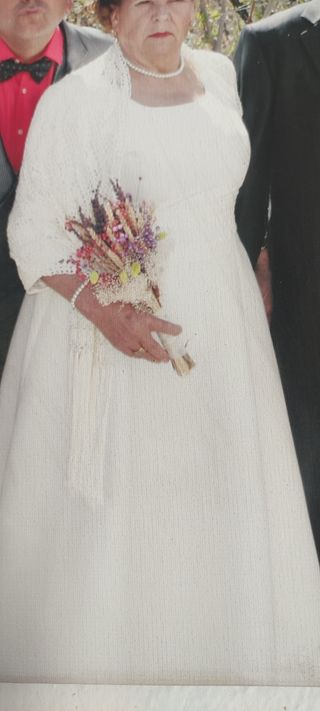 vestido de novia hecho a mano, por modista, liso con costura bordada en cintura y mangas a 3/4 con la misma cenefa, fue para bodas de oro, hace falta llevarlo a la tintorería pero en perfecto estado muy bonito y cuidado