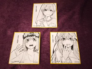 Shikishis de la exhibición "The Quintessential Quintuplets Exhibition / The Quintessential Quintuplets Exhibition REVIVAL" del anime de las Quintillizas por Excelencia ("Quintessential Quintuplets" en inglés o "Gotobun no Hanayome" en japonés) que he ido coleccionando con el paso del tiempo. Tengo de Ichika, Yostuba e Itsuki Nakano con vestido de novia. Son 100% originales y en excelentes condiciones. También acepto cambio por el de Miku de este mismo set. Cada uno se vende por 30€. El precio es negociable y hago descuento al comprar varias cosas. Cualquier cosa/duda no dudes en preguntarme.