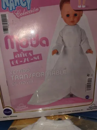 Vestido transformable de novia para la muñeca Nancy, colección Moda de los años 60, 70 y 80. - Incluye vestido y velo. - Complementos para el vestido.