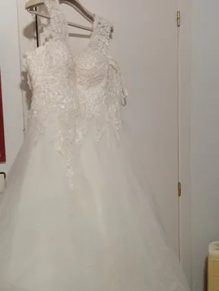 Elegante vestido de novia con detalles de encaje y brillo. Perfecto para tu gran día. - Diseño con tirantes de encaje. - Cuerpo adornado con pedrería y lentejuelas. - Falda de tul vaporosa. En buen estado. Solo habría que arreglar los tirantes y lavarlo Se regala velo largo de brillos a juego con la falda tul del vestido Escucho ofertas