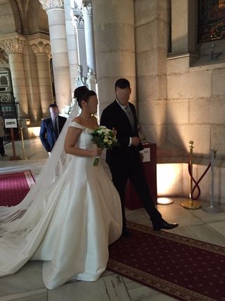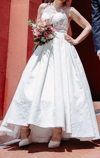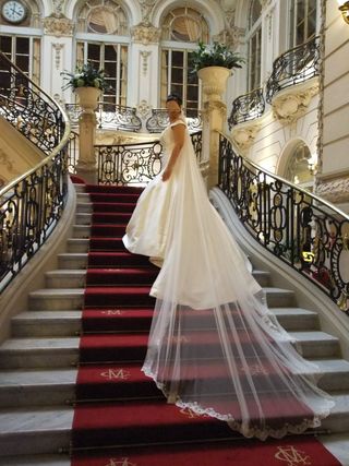 Elegante vestido de novia de la colección 2020, usado una sola vez. Ideal para un día especial. - Talla XL o 42. - Diseño de corte princesa con detalles de encaje en la espalda. - Mangas 3/4. - Falda voluminosa con cola. - Escote de pico. - Detalles con relieve. - Cremallera en la espalda. - Limpieza en tintorería. - Conservado en funda. - Precio original: 2000€. - Precio negociable.
