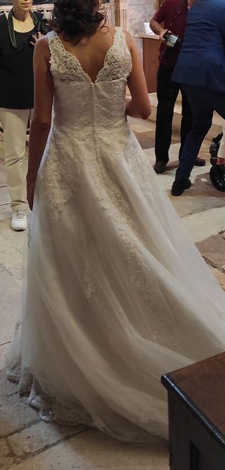 De Pronovias talla 42, pero es como una 40,es todo de encaje,corset ajustable,regalo torera, es opción ponérsela,lo entrego limpio de tintorería,cola media. Tengo más fotos.