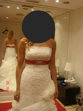 Una autentica locura de vestido. Comprado en la tienda Sedka de Madrid. yo mido 1.67 y peso 66 kilos. llevaba tacon en la boda. una talla L. Te lo puedes probar sin Compromiso. Si te lo quedas te regalo el velo verde que está valorado en 150€ y podemos mirar algún accesorio más que tenga de ese día. El vestido me costó 1400 euros.