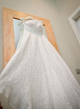 Vestido de novia de la alta costura. 100%seda. Sienta muy bien. Necesita llevar a la tintorería a planchar. Tiene los bajos un poco rozados