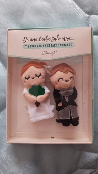 Set de marionetas de novios de la marca Mr Wonderful. - Muñecos de tela con diseño divertido. - Incluye novio con traje y novia con vestido y ramo. - Perfecto para regalar en tu boda a unos novios que quieres que se casen . - Agotadisimo.