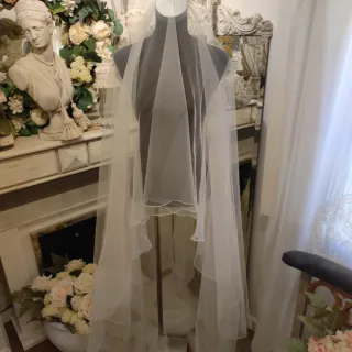 Elegante velo de novia de la firma Giorgio Novias. Un accesorio delicado para tu gran día. Velo de novia firma Giorgio Novias color blanco con medidas 220X350cm. Nuevo de liquidación de tienda de novias y eventos. Valorado en 490€ . Precio de venta 100€. - Diseño con varias capas de tul. - Adornado con sutiles detalles bordados. - Acabado con borde festoneado.