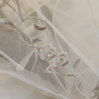 Elegante velo de novia de la marca Ilusión. Un accesorio que aporta un toque de distinción a tu atuendo nupcial. Velo novia color natural firma Ilusión. Elegante bordado en contorno a tono en hilo de seda . Valorado en 385€ . Precio venta 110€. Nuevo de liquidación de tienda de novias y eventos. - Diseño de tul ligero. - Adornado con un delicado borde festoneado.