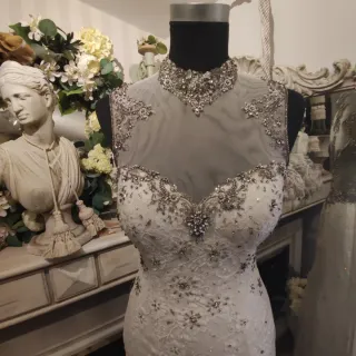 Vestido de novia de la firma Stiletto, talla 40. Es un modelo nuevo. Vestido de novia firma Stiletto T40. Color Ivory. Atado a cuello con favorecedor escote decorado en pedrería. Corte griego. Precio liquidación 200€. Nuevo de liquidación de tienda de novias y eventos. - Diseño elegante con pedrería en el escote. - Tejido vaporoso y fluido.