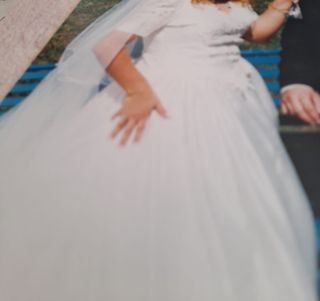 color blanco roto con detalles de encaje el pecho c,cola y mangas. t 40 más fotos por privado . incluye cancán y velo largo de tul