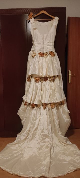 Traje de novia para chica con talla 36-38. Se encuentra en muy buenas condiciones, solo tiene una pequeña quemadura de cigarrillo en la cola ( fotografía número 8 ) y el falso del bajo parcialmente descosido. Fabricado en España. El cancan va también incluido.