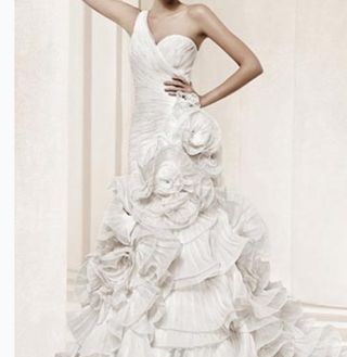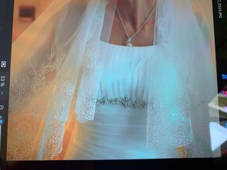 Costó nuevo 2800€. Es de gasa con cola no demasiado larga. Escote en V. Con vuelo no excesivo. Blanco con pedrería bajo el pecho. Es fuerte y bien terminado, congela que le da consistencia debajo de la gasa.
